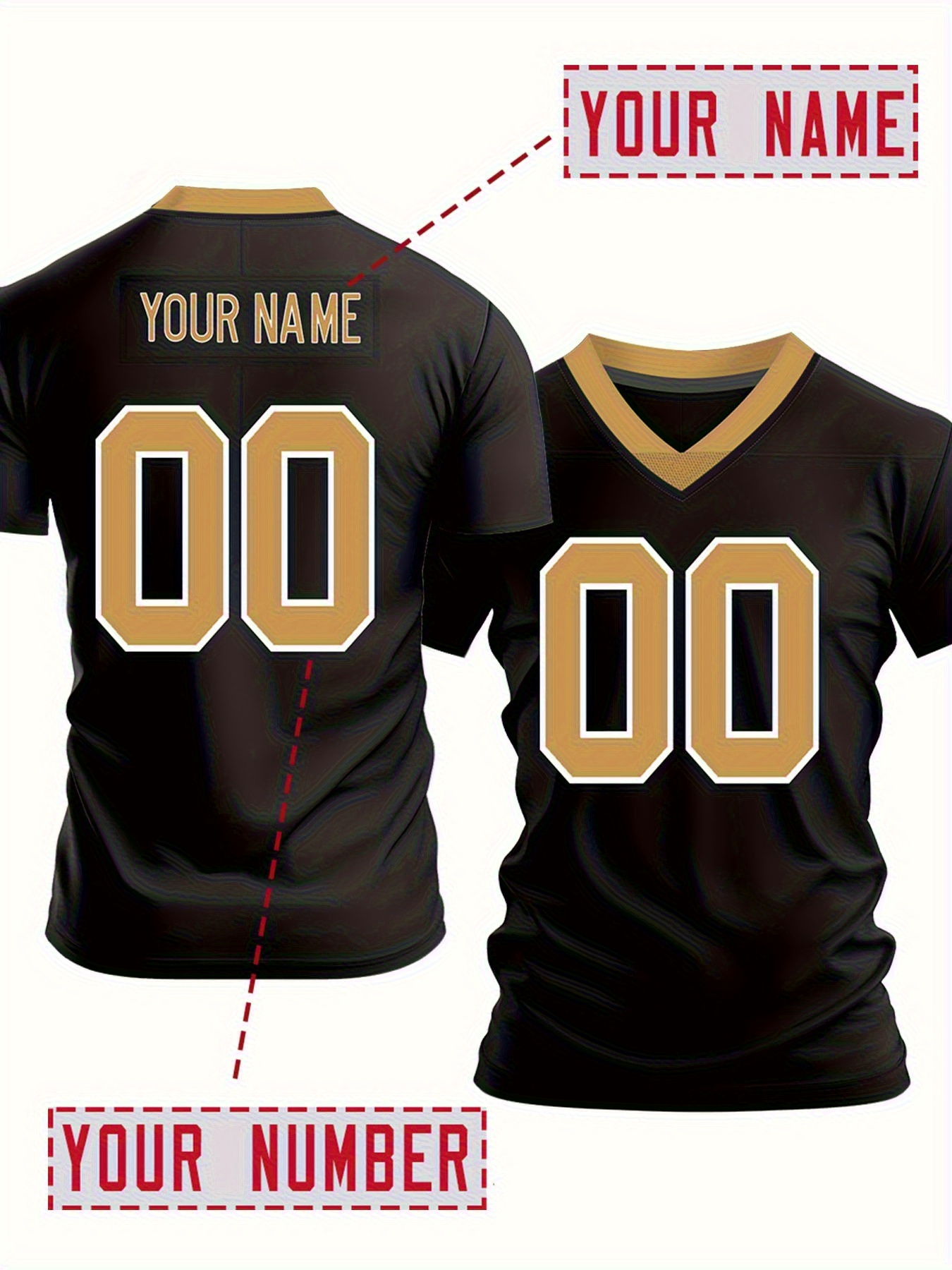 Customizable Women'S Plus Size Football Jersey T-Shirt - Personalized Team Name & Number, Black with Golden Accents, V-Neck, Short Sleeve, Summer Sports Tee, Football Jersey, PLUS SIZE