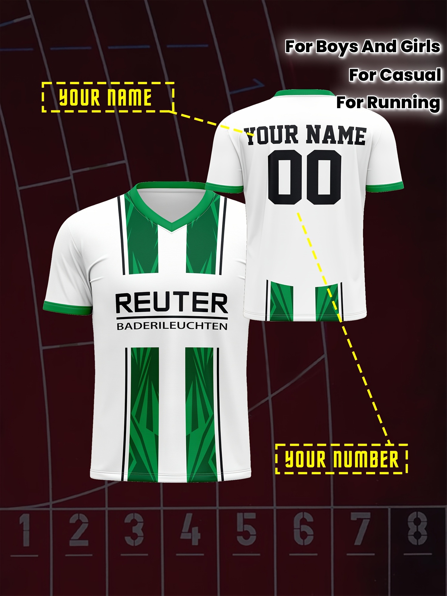 Customizable Kids Soccer Jersey with V-Neck, Polyester Sports Shirt, Medium Stretch Knit Fabric, All-Over Print, Regular Fit, with Name and Number, for Boys and Girls, Casual, Running, Training, Football, Spring/Summer/Fall, Ages 12 and Under