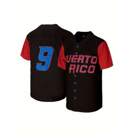 Men's Puerto Rico #9 Embroidered Baseball Jersey - Black & Red V-Neck, Button-Up, Loose Fit for Sports, Parties & Casual Wear, Puerto Rico Shirt