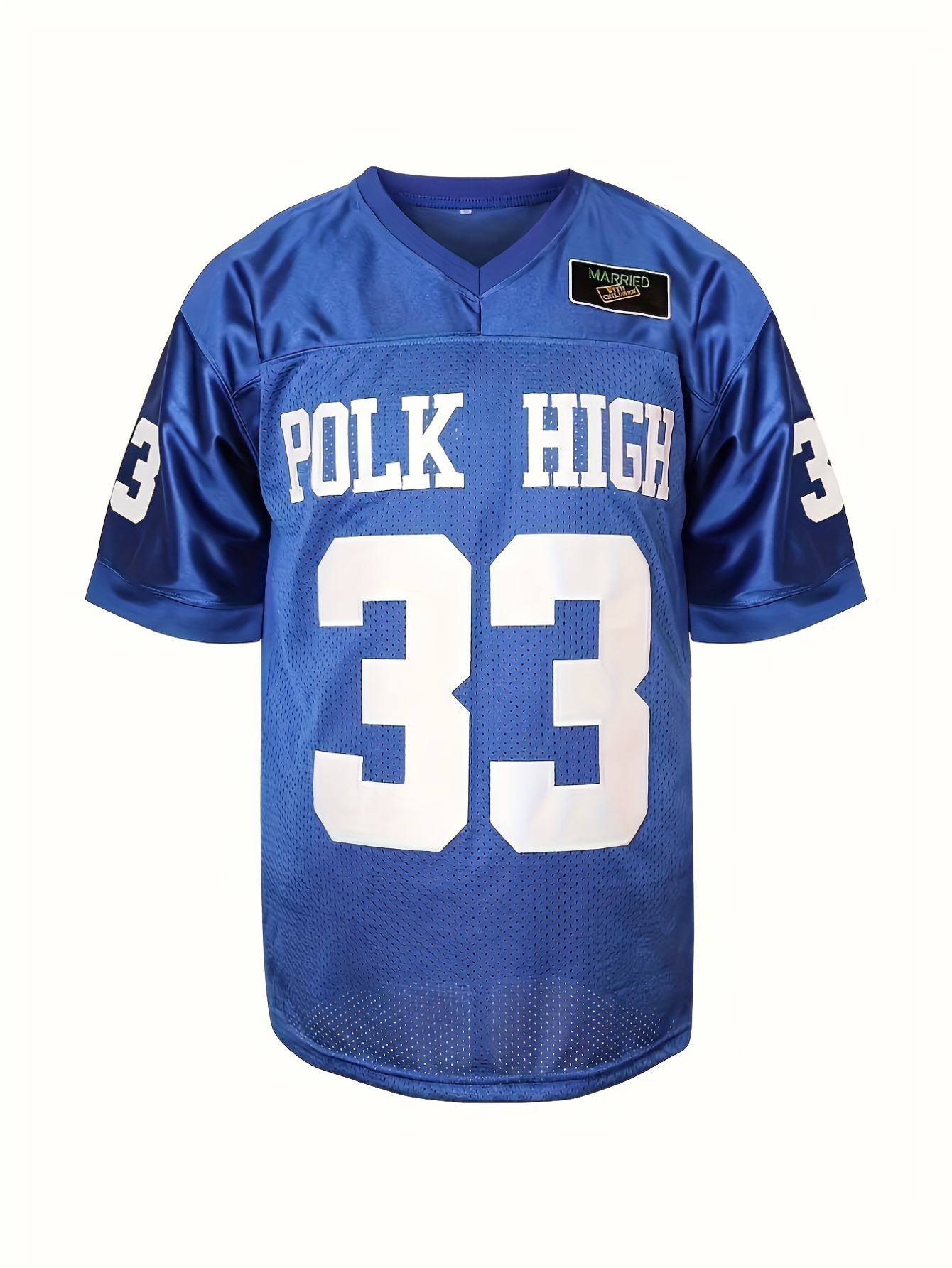 Men's #33 Vintage Embroidered Football Jersey, Blue V-Neck Training Shirt with "POLK HIGH" Design, American Football Team Apparel for Casual Wear, Parties, and Sports Events