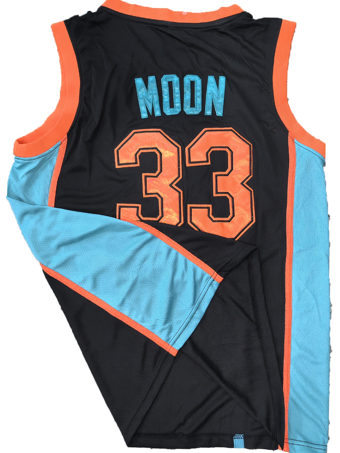 Men's #33 "MOON" Embroidered Basketball Jersey - Breathable, Sleeveless, V-Neck in Black with Blue & Orange Accents, Ideal for Sports, Outdoor Activities & Casual Wear